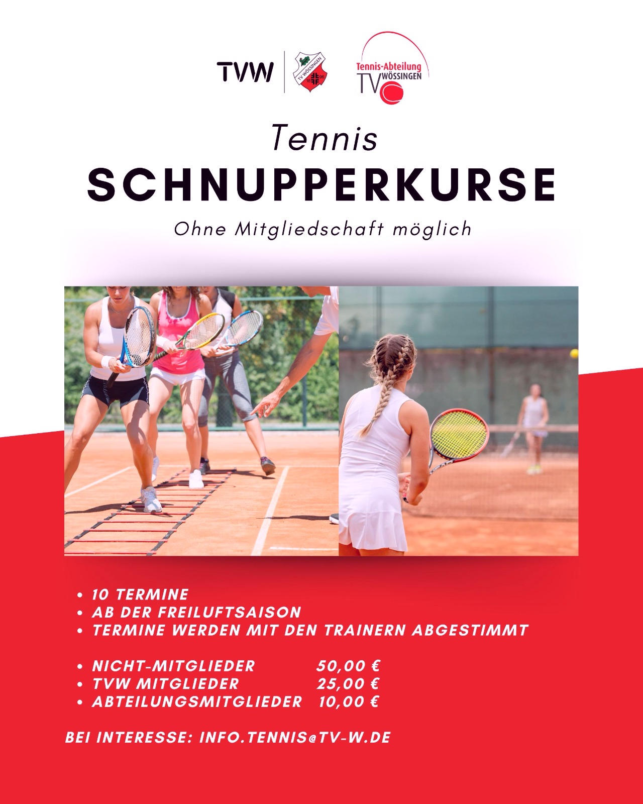 Egal ob du noch nie einen Schläger in der Hand hattest oder du nach Jahren mal wieder gerne einen in die Hand nehmen möchtest - komm zu uns und Schnupper rein, unsere Trainer zeigen dir die ersten Schritte auf dem Tennisplatz, du brauchst nur sportliche Kleidung und etwas zu Trinken mitzubringen, Tennisschläger und Bälle werden von uns für die Dauer des Schnuppertrainings gestellt.