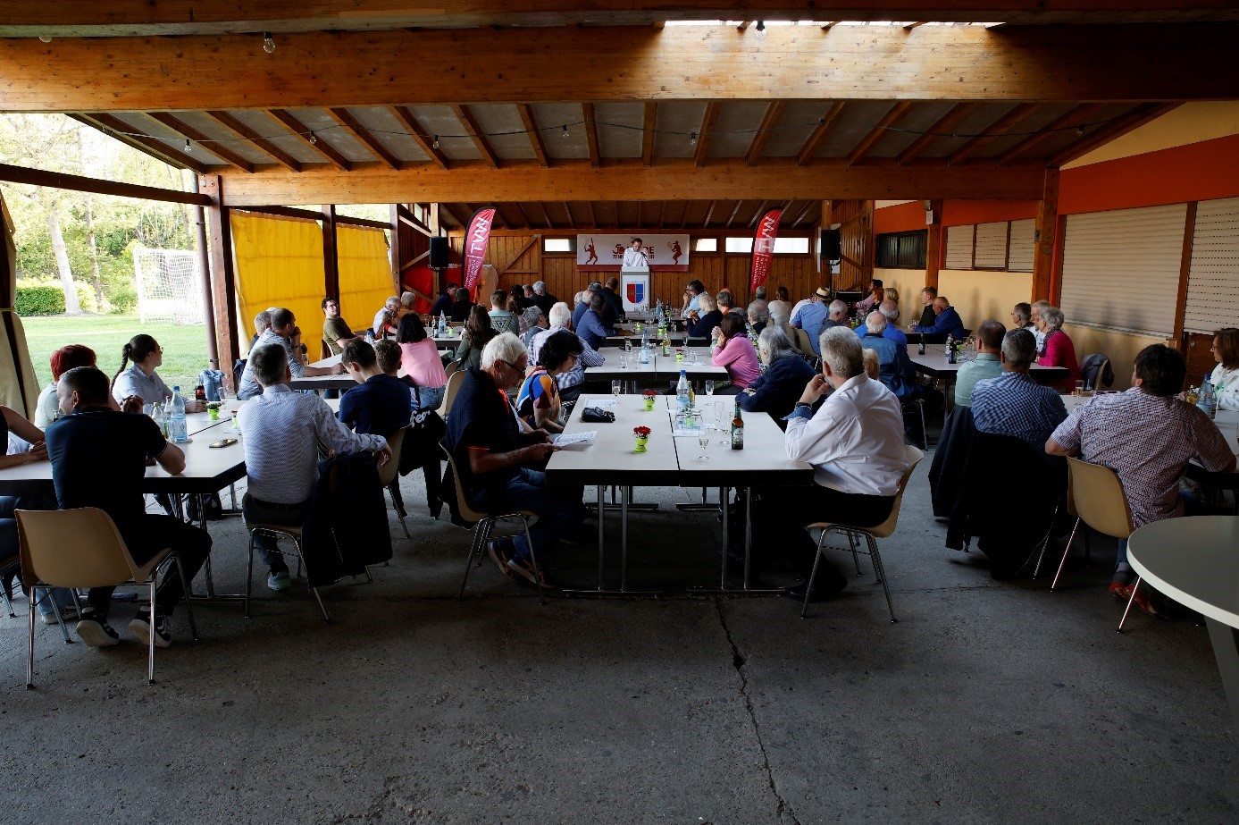 Die Landesturnfestfahne weht im Hintergrund
